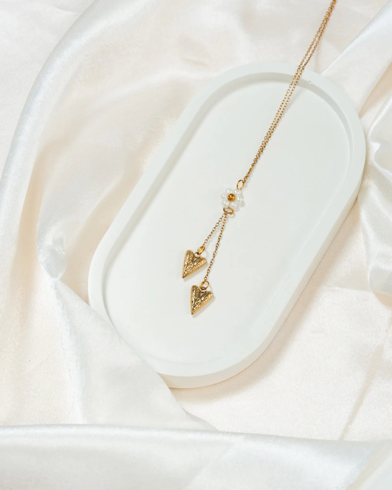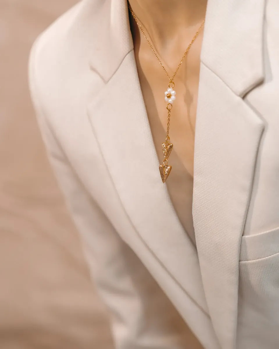 Featuring a delicate pearl flower charm paired with twin gold hearts, this necklace blends sentiment with sophistication—making it a beautiful choice for both daily elegance and special occasions.